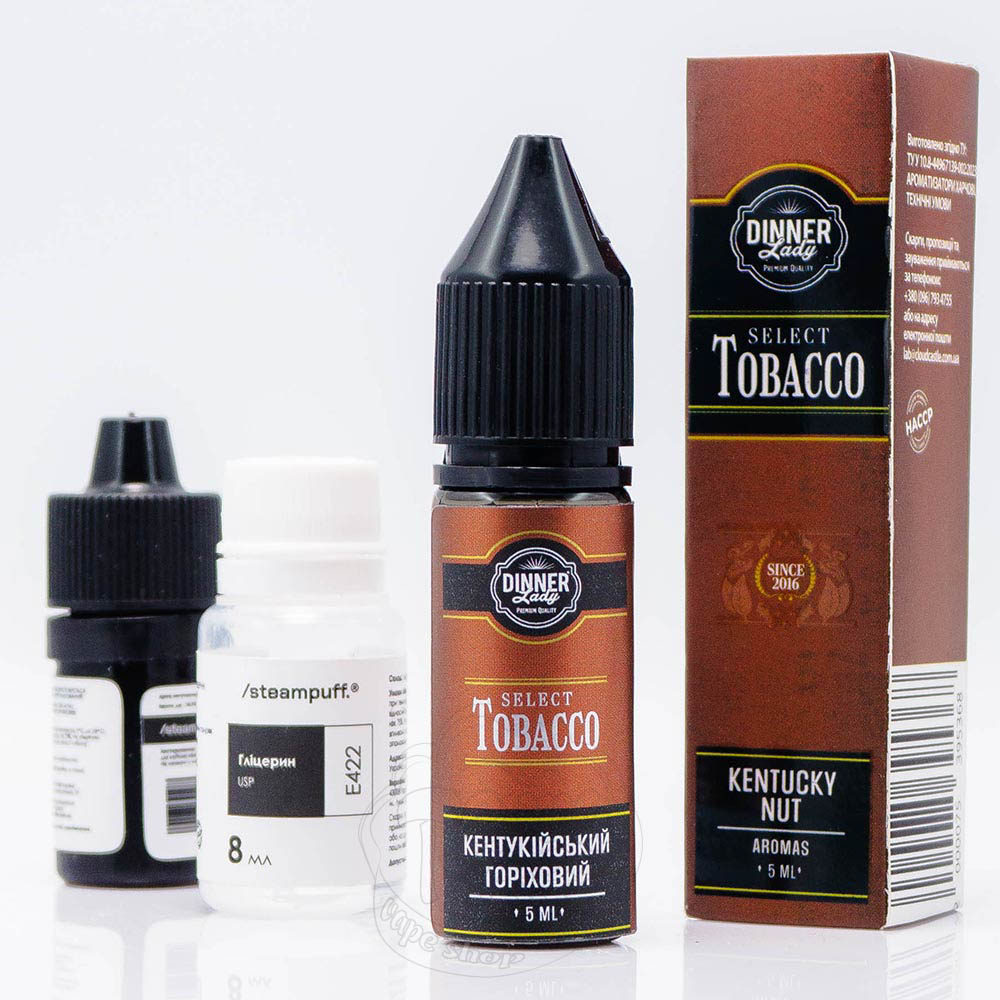 Dinner Lady Select Tobacco Salt Kentucky Nut 15ml 50mg - это компоненты для замешивания жидкости со вкусом кентуккийского табака с копченым ароматом и нотками сладкого ореха.
