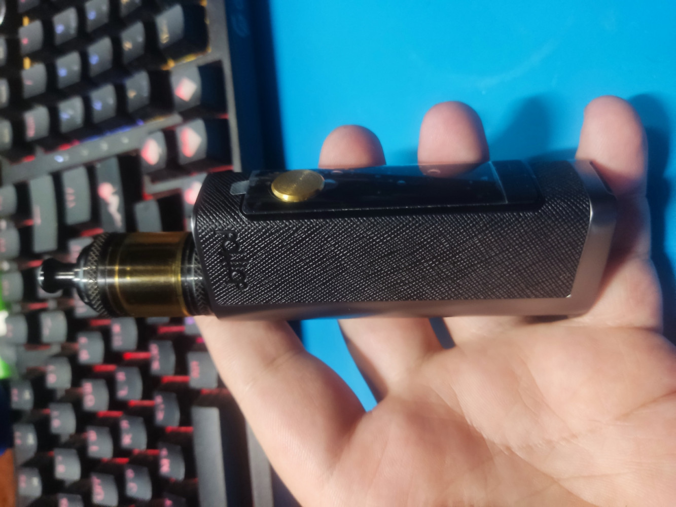 Оформлення пристрою не захаращене зайвими елементами дизайну, тут все стисло та лаконічно, але не менш привабливо від того. Збоку знаходиться ледь помітний логотип dotMod, який має спільний зі шкіряним елементом колір. Вгорі є 510 коннектор, а також крихітний перемикач, який відповідає за блокування девайсу. У передній частині розташована висока чорна панель, яку ділять між собою золотиста кнопка активації, виконана у фірмовому стилі бренду, кольоровий дисплей та дві навігаційні кнопки "-" і "+". На дні є непомітна чорна заглушка, а під нею ховається зарядний порт Туре-С. Поруч знаходиться різьбова кришка батарейного відсіку.