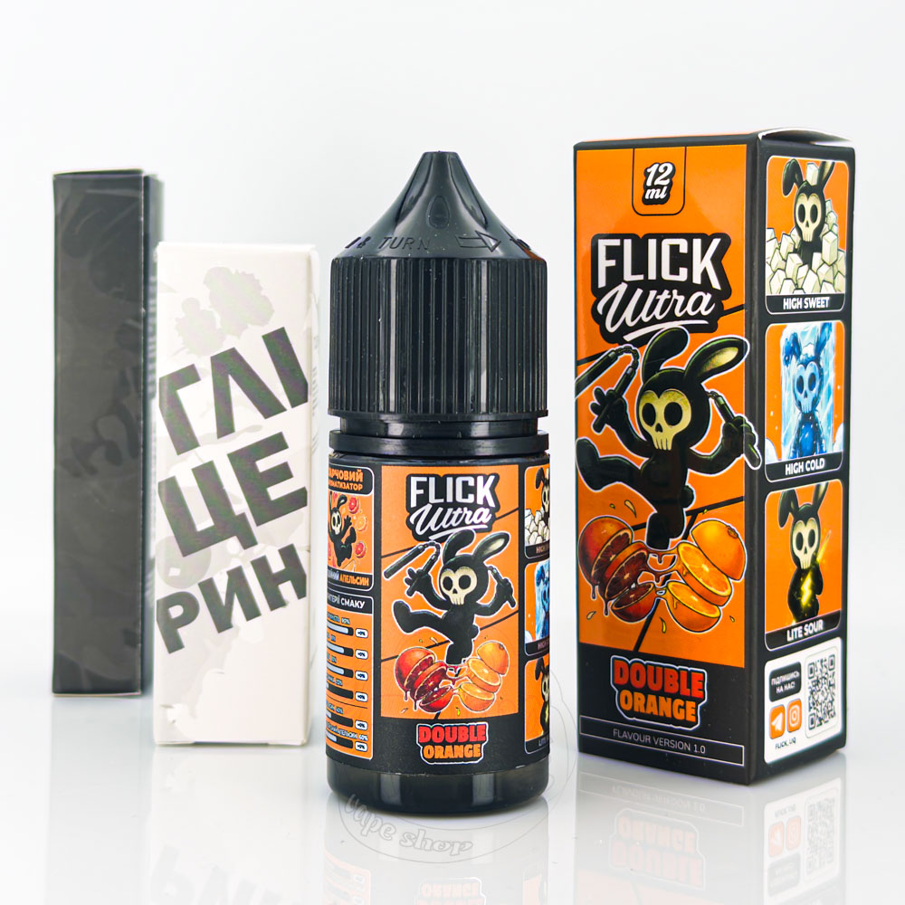 Flick Ultra Salt Double Orange 30ml 50mg - це компоненти для самозамісу рідини з насиченим смаком класичного соковитого апельсина в дуеті з червоним сицилійським апельсином. Соковите поєднання супроводжується легкою кислинкою та вираженою прохолодою.