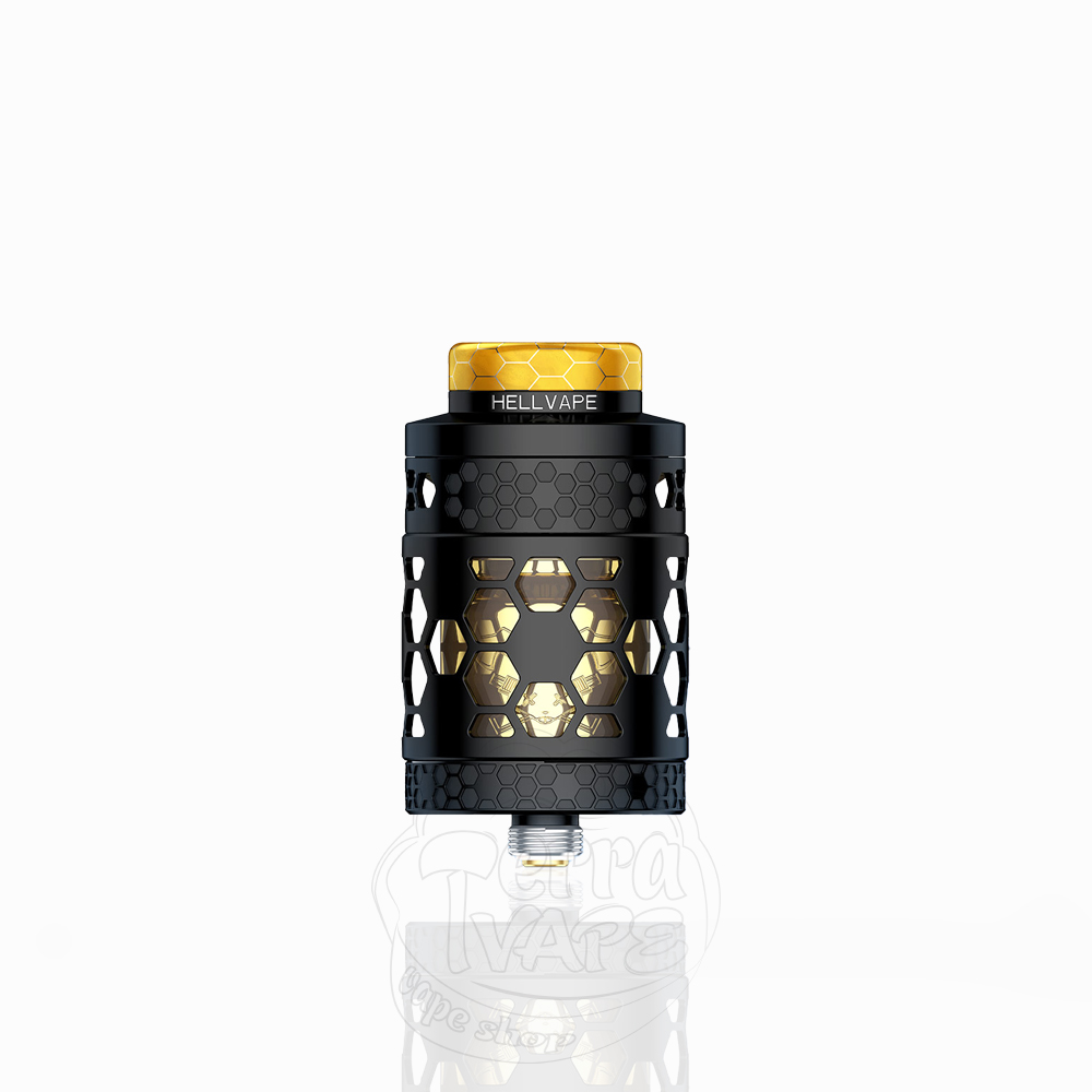 Hellvape Dead Rabbit 4 RTA Pro Tank Atomizer Black Gold - це про-версія четвертого обслуговуваного баку Dead Rabbit, золотисто-чорного кольору від відомої в світі вейпінгу компанії Hellvape. Заправка верхня, об'єм резервуару становить 3.5мл, а з бабл склом - 5.5мл. База тут діаметром 26мм, а простора дека передбачає установку 2 спіралей. Обдув верхній та регулюється за допомогою обертання кільця обдуву. 810 дріп-тип знімний з можливістю заміни.