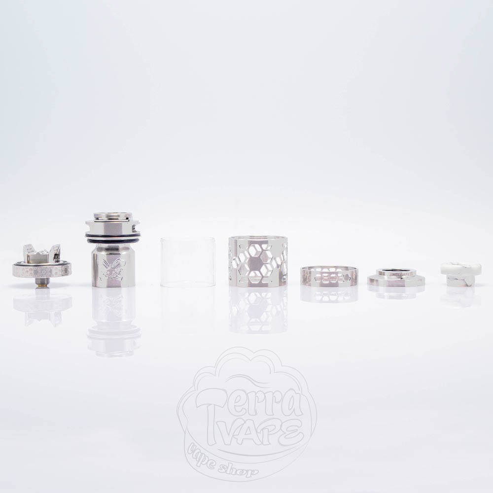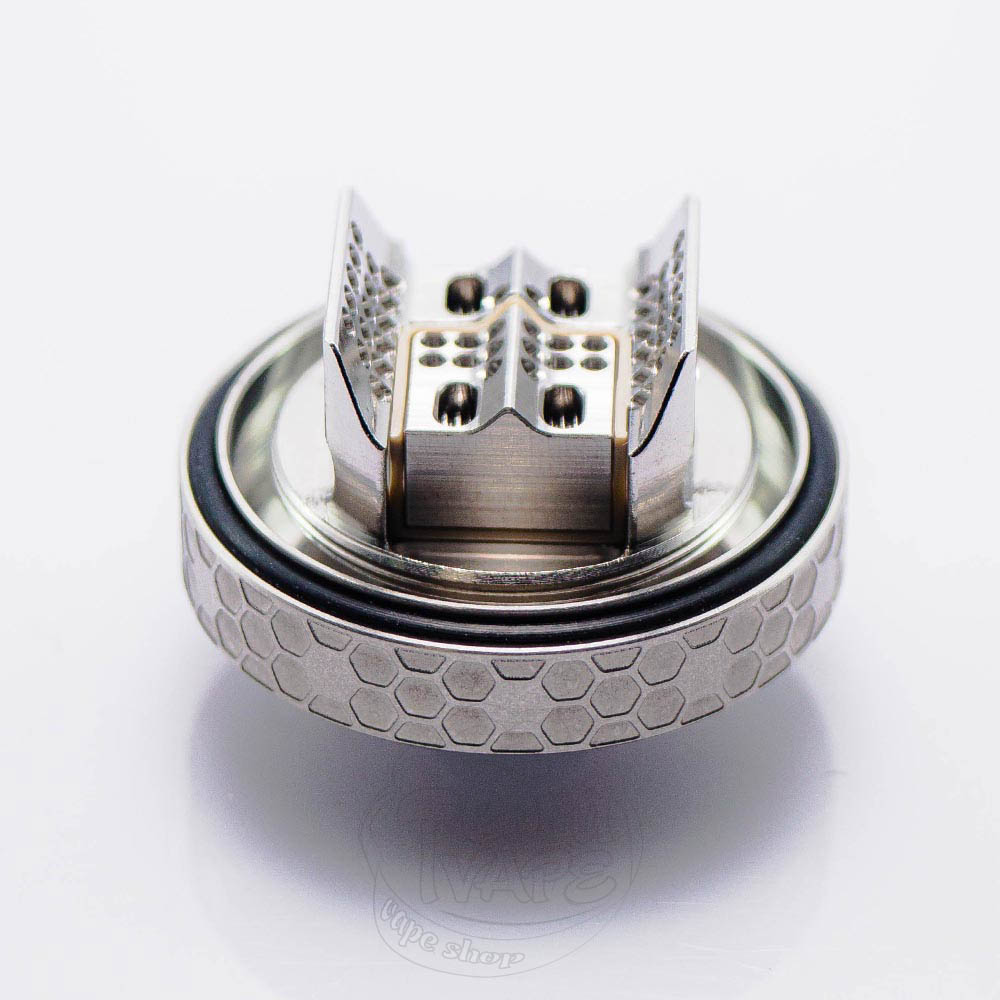 Dead Rabbit 4 RTA Pro покрыт отделкой, напоминающей медовые соты, которые намекают нам на систему обдува внутри - «Honey Comb». Кольцо обдува по каждой стороне покрыто отверстиями, представляющими собой по три шестиугольника с двумя парами маленьких прорезей между ними. Ниже, PCTG колба закрыта решеткой - это, так называемая, броня, защищающая резервуар от ударов и непредвиденных сценариев, которые могут ему навредить.
