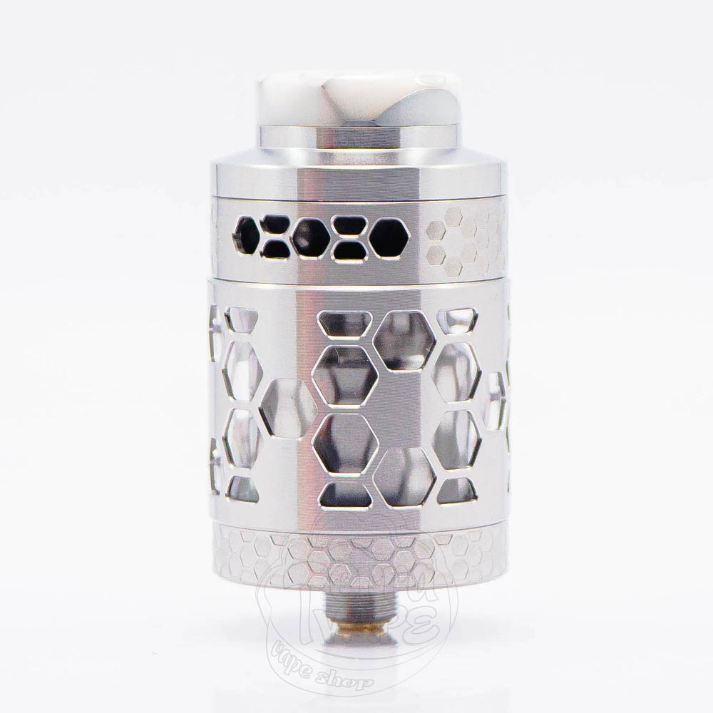 Dead Rabbit 4 RTA Pro покрыт отделкой, напоминающей медовые соты, которые намекают нам на систему обдува внутри - «Honey Comb». Кольцо обдува по каждой стороне покрыто отверстиями, представляющими собой по три шестиугольника с двумя парами маленьких прорезей между ними. Ниже, PCTG колба закрыта решеткой - это, так называемая, броня, защищающая резервуар от ударов и непредвиденных сценариев, которые могут ему навредить.