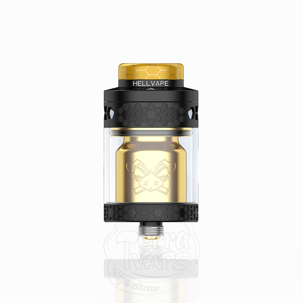 Hellvape Dead Rabbit 4 RTA Tank Atomizer Black Gold - це четверта версія Dead Rabbit RTA чорно-золотистого кольору від популярного та надійного виробника Hellvape. Діаметр бази становить 26мм. Об'єм 3.5мл, а з бабл-склом - 5.5мл. Безстоєчна дека, ширина якої становить 13мм, розрахована на установку двох спіралей. Обдув верхній та регулюється завдяки рухомому кільцю. Отвір для заправки знаходиться зверху, а побачити його можна, здвинувши топ-кеп у напрямку стілки, що зображено біля 810 дріп-типу.