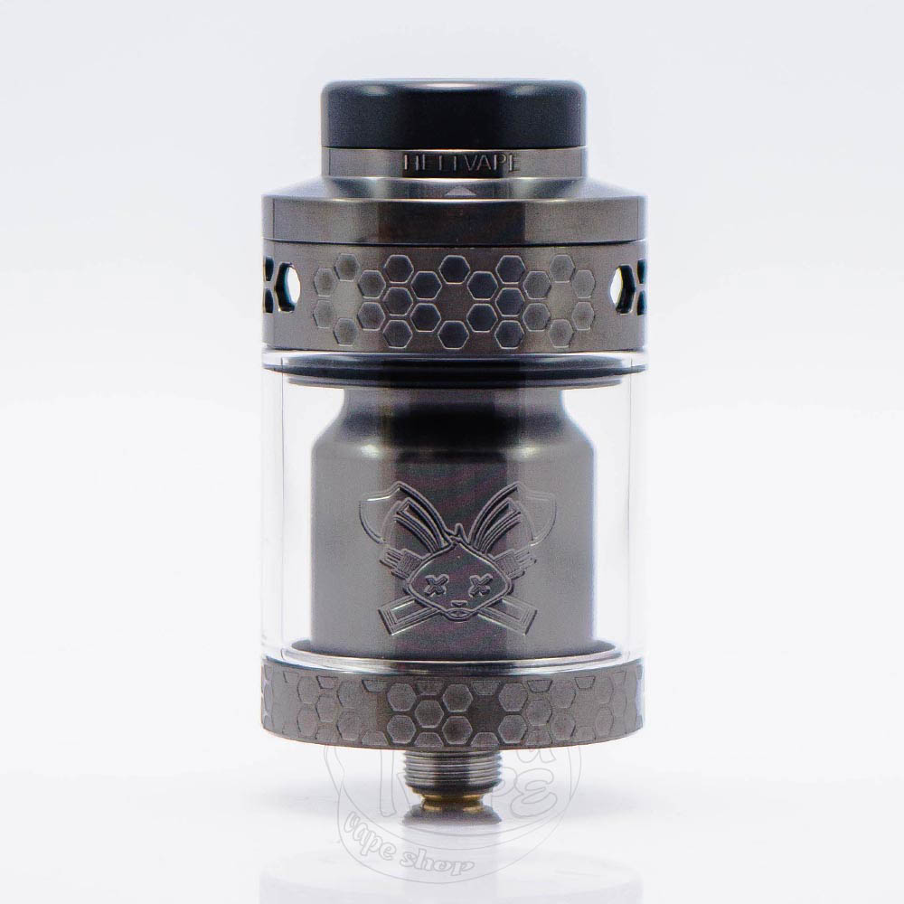 Hellvape Dead Rabbit 4 RTA Tank Atomizer Gunmetal - это четвертая версия Dead Rabbit RTA серого цвета от популярного и надежного производителя Hellvape. Диаметр базы составляет 26мм. Объем 3.5мл, а с бабл-стеклом - 5.5мл. Безстоечная дека, ширина которой составляет 13мм, рассчитана на установку двух спиралей. Обдув верхний и регулируется благодаря подвижному кольцу. Отверстие для заправки находится сверху, а увидеть его можно, сдвинув топ-кеп в направлении стрелки, что изображена рядом с 810 дрип-типом.