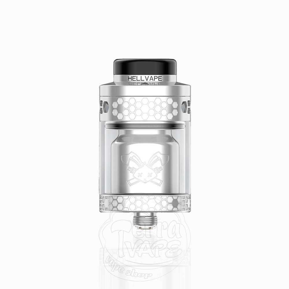 Hellvape Dead Rabbit 4 RTA Tank Atomizer S.S - це четверта версія Dead Rabbit RTA сріблястого кольору від популярного та надійного виробника Hellvape. Діаметр бази становить 26мм. Об'єм 3.5мл, а з бабл-склом - 5.5мл. Безстоєчна дека, ширина якої становить 13мм, розрахована на установку двох спіралей. Обдув верхній та регулюється завдяки рухомому кільцю. Отвір для заправки знаходиться зверху, а побачити його можна, здвинувши топ-кеп у напрямку стілки, що зображено біля 810 дріп-типу.