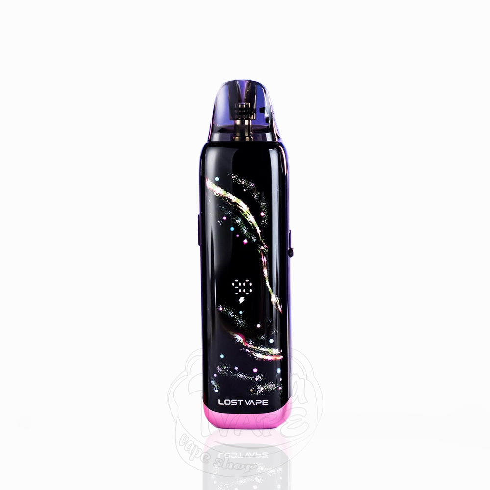 Lost Vape Galaxy T360 Pod System Kit 1200mAh Sakura Galaxy - це багаторазова POD-система чорного кольору з рожевими сівтлодіодами і нижньою частиною, від досить відомої на вейп-ринку компанії Lost Vape. Містить в собі вбудований акумулятор ємністю 1200mAh та заряджається від порту Type-C, а також підтримує швидку зарядку 5V/2A. Максимальна вихідна потужність складає 35W. Девайс сам підлаштовує сумісний ватаж під опір картриджу, який використовується. На корпусі є слайдер - регулятор тугості затяжки. Пристрій сумісний з усіма картриджами лінійки Урса, а попередньо вбудований - Ursa V3 з нагрівальним елементом опором 0.8Ом та об'ємом 2.5мл, з верхньою заправкою. Активація автоматична - через затяжку.