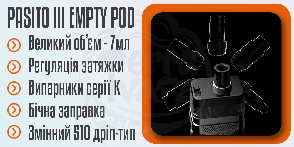 Разом з Pasito 3 виробник презентував оновлений картридж з великим об'ємом - 7мл, який сумісний не лише з його супроводжуючим пристроєм, а й з минулою версією моделі - Pasito 2. Але також варто зазначити, що картриджі другого покоління не підходять Пасіто 3.