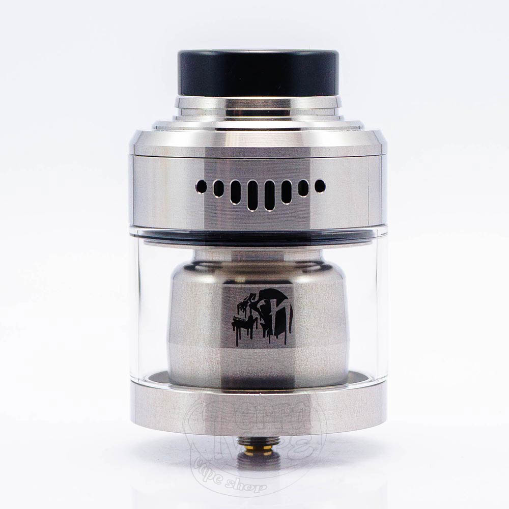 Бак действительно больших размеров имеет высоту 57мм и диаметр 40мм. Сам дизайн сдержанный, металлическая поверхность гладкая и не имеет никаких украшений. На кольце обдува находятся два ряда отверстий. На куполе, за стеклянным резервуаром, виден логотип линейки.