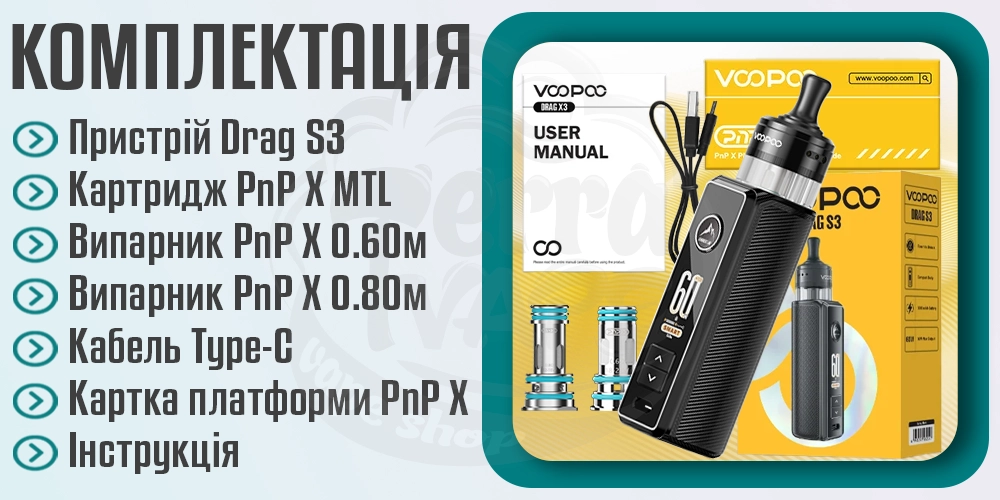 Разом з Драг С3 в наборі йде картридж PnP-X для затяжки в MTL-стилі з бічною заправкою та об'ємом 5мл. Випарники у картриджа замінні: попередньо встановлений має опір 0.6Ом, а додатковий - 0.8Ом.