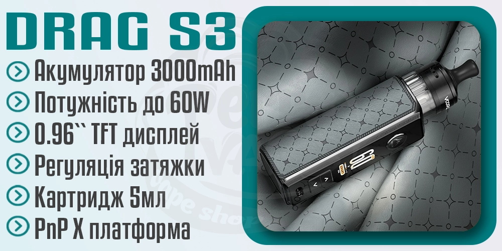 Драг С3 - невеликий под-мод, який легко лягає в руку та має елегантний та стильний дизайн. Матеріали виготовлення - цинковий сплав та еко-шкіра. Вони позитивно впливають як на зносостійкість, так і на його вигляд і тактильні відчуття.