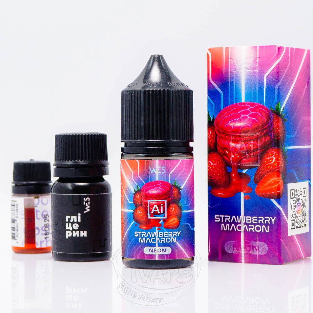 WES AI Neon Salt Strawberry Macaron 30ml 65mg - это набор для самостоятельного замешивания жидкости с десертным вкусом французского клубничного макарона, с кремово-миндальной ноткой на выдохе.