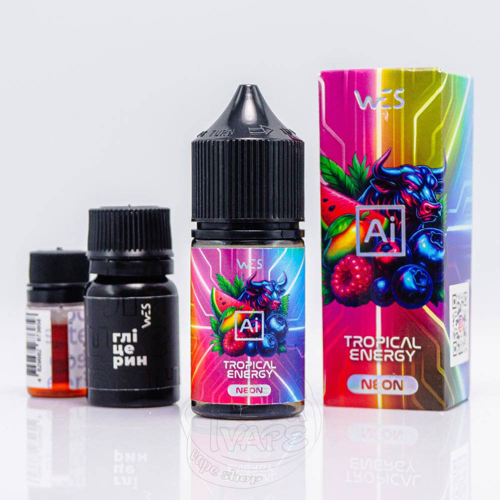 WES AI Neon Salt Tropical Energy 30ml 50mg - это набор жидкости со вкусом энергетика с нотками тропических фруктов и ягод.